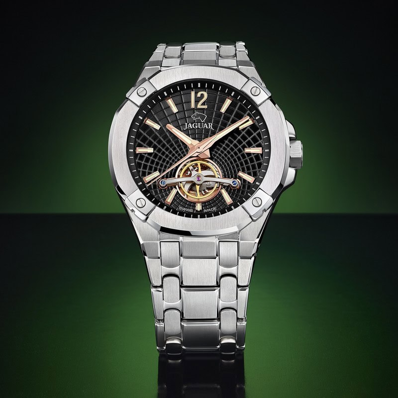 La collezione di orologi Jaguar Balancier è disponibile in quattro colori, con cassa in acciaio inossidabile e bracciale “Snake”.