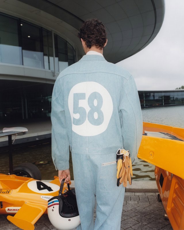 La collezione Levi’s x McLaren Racing include diversi capi distintivi: una giacca, una tuta e un paio di guanti da corsa, una giacca Heritage Trucker, i jeans Heritage 501, una t-shirt Constructors e una bandana. Ogni pezzo è ispirato all’estetica vintage di McLaren Racing, con un design che riflette la storia e l’eleganza dei due marchi.