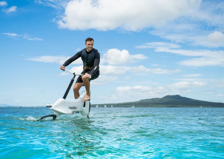 Pensata per riprodurre fedelmente l’esperienza ciclistica sull’acqua con un motore e-bike e due foil in fibra di carbonio (le ali), l’Hydroifoil Bike di Manta5 è il frutto di un’idea del visionario fondatore neozelandese, Guy Howard-Willis, con un passato nel mondo degli sport acquatici e una passione per il ciclismo. Ci sono voluti 8 anni di progettazione e ben 7 prototipi, prima di arrivare al modello definitivo, appena licenziato, XE-1.