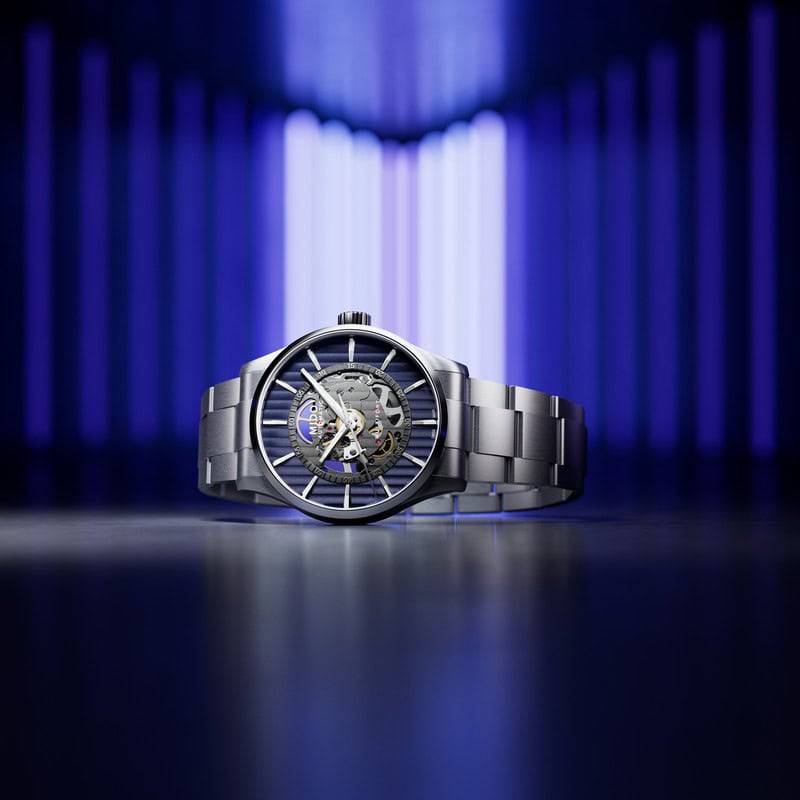 L’orologio si distingue per il suo quadrante scheletrato, che offre una visione chiara del suo complesso ingranaggio. Il blu unico del quadrante si mescola con le rifiniture Cotes de Genève che scorrono lungo l’anello esterno e sulla platina antracite del movimento. Guarniti dalla Super-LumiNova bianca, gli indici sfaccettati tagliano il blu del quadrante e sono accentuate da un minutaggio centrale antracite. Anch’esse luminescenti, le brillanti lancette delle ore e dei minuti scorrono sul quadrante, accompagnate dalla lancetta dei secondi e protette dal vetro zaffiro con trattamento antiriflesso su entrambi i lati.