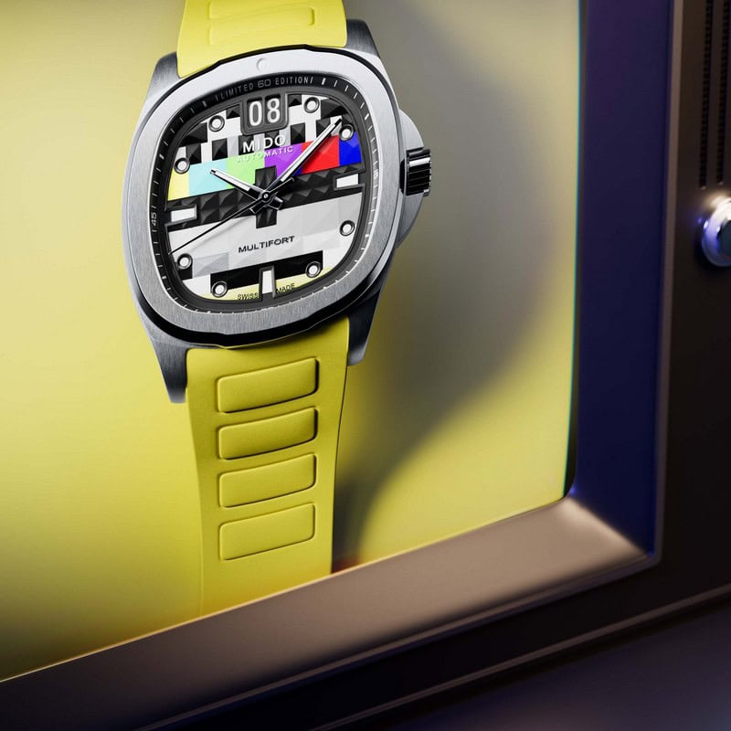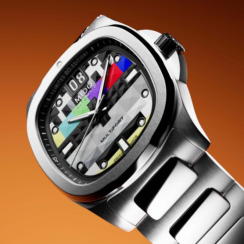 In un tributo unico all’epoca d’oro della televisione, Mido lancia il Multifort TV Big Date S01E01, una fusione spettacolare di estetica retrò e tecnologia all’avanguardia. Questa edizione limitata a soli 999 esemplari si distingue per il suo quadrante, che racchiude dettagli geometrici tridimensionali e colorati, che ricordano l’epoca in cui le famiglie si riunivano attorno agli schermi televisivi.