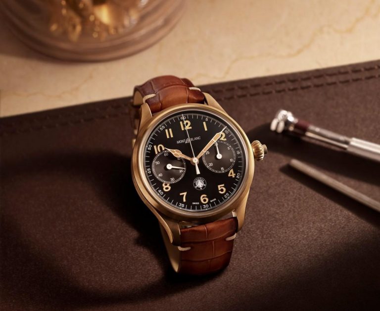 Il Montblanc 1858 Monopusher Chronograph Origins presenta un nuovo cinturino in stile vintage in pelle di alligatore marrone Sfumato con cuciture beige ed è disponibile in un’edizione strettamente limitata di 100 pezzi.