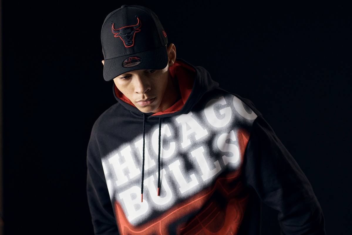 Ogni bomber presenta, davanti e dietro, una stampa collage all-over con i loghi di alcune squadre dell’NBA, realizzati in colori vivaci che richiamano le insegne al neon. Tra i loghi figurano quello dei New York Knicks e dei Boston Celtics nei colori ufficiali, ma con un effetto sfumato lucido. Invece la felpa con il cappuccio e i joggers presentano sul davanti solo lo stemma dei Chicago Bulls in versione grande.