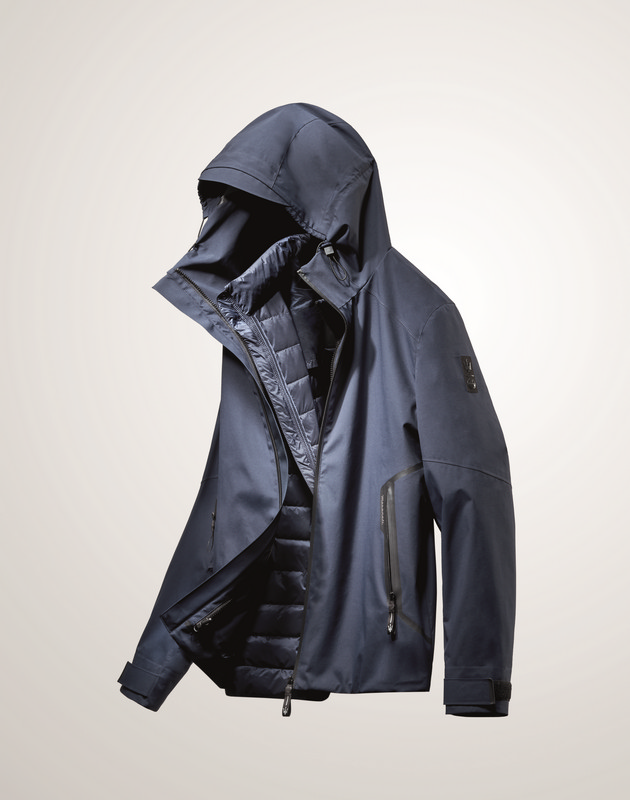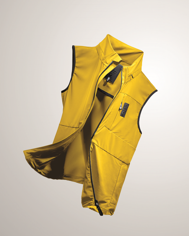 I capi di abbigliamento sono realizzati in materiali orientati al futuro, dal cotone biologico e riciclato al Gore-Tex Infinium high-performance. Gli elementi chiave – dai giubbotti ibridi a una elegante rivisitazione della classica polo alla giacca in due lunghezze perfetta per viaggiare – sono esempi delle tecnologie più sviluppate attualmente disponibili nel settore.