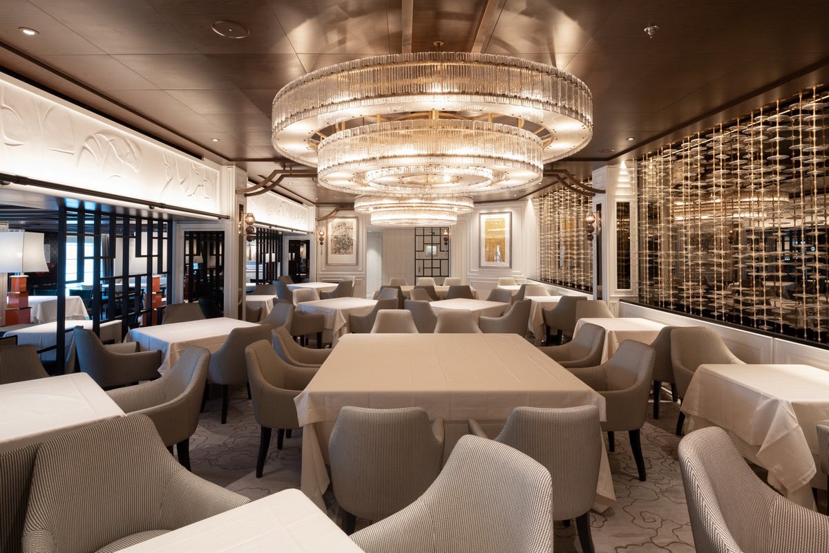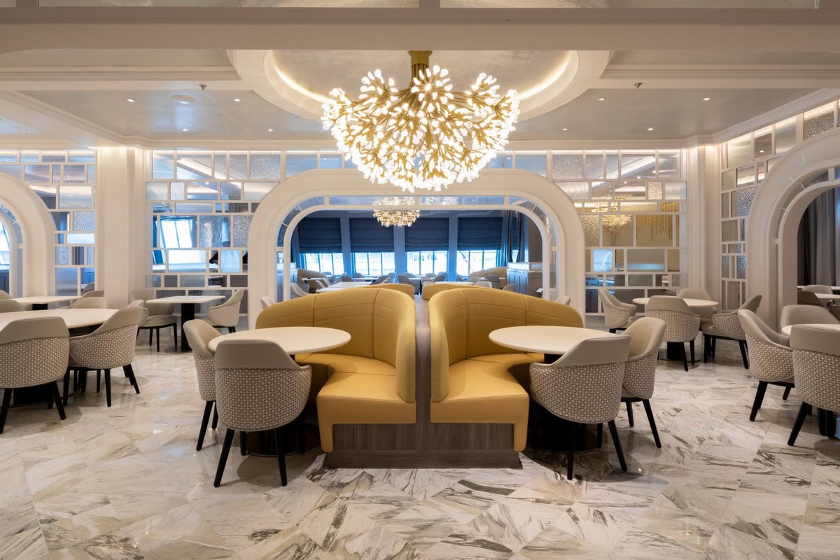Pensata per offrire un’esclusiva esperienza culinaria, il Grand Dining è la principale sala da pranzo a bordo. Con i suoi oltre 1000 mq è caratterizzato da motivi floreali e texture che richiamano il mondo vegetale immergendo il visitatore in un raffinato giardino d’inverno. I pavimenti in parquet disegnati su misura e le tappezzerie dipinte a mano danno la sensazione di essere seduti sotto un albero. L’illuminazione, accuratamente selezionata, mette in risalto i dettagli architettonici.