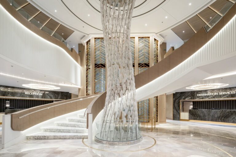Ispirato alle linee organiche della conchiglia del Nautilus, l’Atrio di Oceania Vista accoglie gli ospiti a bordo introducendo un senso di calma e spaziosità attraverso un layout ampio e ordinato. La scala a chiocciola, che scende verso il basso, e il disegno delle pareti e del pavimento che ne seguono la forma, sembrano ricreare l’ideale interno della conchiglia che avvolge l’ospite.