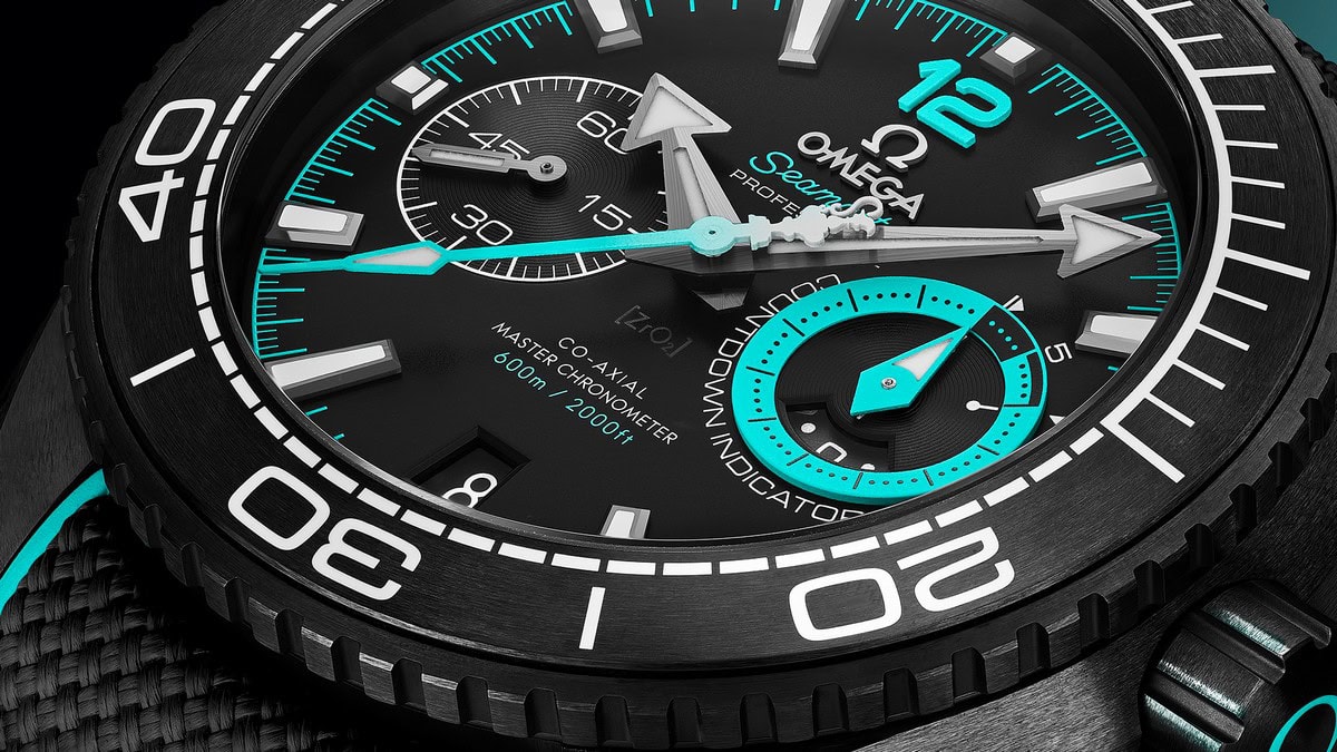 Il Seamaster Planet Ocean da 45,5 mm unisce il nero più profondo con il turchese del logo di Emirates Team New Zealand. La cassa in ceramica nera è completata da una lunetta unidirezionale in ceramica nera spazzolata con la scala subacquea in smalto bianco e punto triangolare a ore 12, con la Super-LumiNova bianca che emette una luce verde.