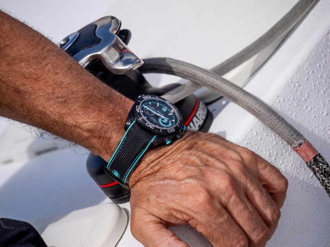 Sul quadrante in ceramica opaca, Omega ha inserito un omaggio al protocollo del pre-gara con un indicatore del conto alla rovescia a ore 3, contrassegnato dallo Start. La lancetta dell’indicatore e l’anello del contatore sono turchesi come il logo di Emirates Team New Zealand, così come la minuteria, il numero 12 e la lancetta centrale dei secondi con il simbolo del trofeo dell’America’s Cup come contrappeso.