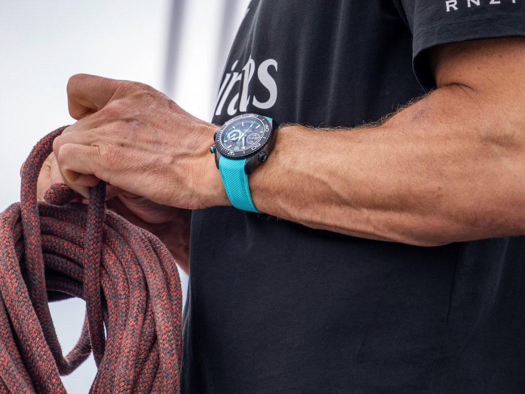 Omega presenta l’orologio con cinturino in caucciù strutturato nero e turchese con cuciture turchesi e chiusura in ceramica nera, e offre tre alternative per cambiarne il look: un ulteriore cinturino in caucciù e due cinturini Nato, tutti in colori complementari. Per conservare l’orologio da vela al sicuro e all’asciutto quando si è a terra, c’è una speciale scatola di presentazione ispirata al logo di Emirates Team New Zealand.