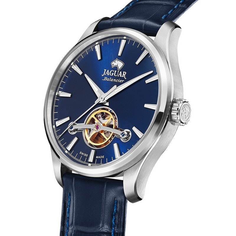 Jaguar Balancier è una collezione interamente Swiss Made caratterizzata da elevati standard tecnici e da un design che, pur privilegiando un’estetica essenziale, nasconde un meccanismo di grande complessità: dall’apertura a ore 6 si può intravedere parte del cuore pulsante dell’orologio, il bilanciere. L’esperienza visiva è di grande impatto: si rimane affascinati dall’armonia del movimento automatico con 44 ore di riserva di carica, 23 rubini e protezione anti-shock Incabloc a doppio cono.