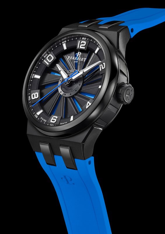 Perrelet ha declinato il nuovo Turbine 41 in dieci referenze: quattro con la cassa in titanio e il sotto quadrante nei toni del blu, del verde, del rosso o del nero, abbinato per la prima volta ad un bracciale integrato in titanio; e altre sei con la cassa in titanio DLC nero e il cinturino in caucciù coordinato nel colore al sotto quadrante: giallo, arancione, rosso, verde inglese, blu o nero. Quest’ultimo a comporre un’edizione total black dal forte impatto visivo.