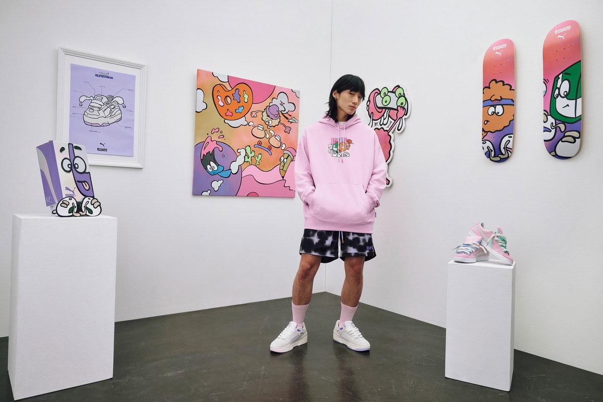 Artista e designer, nonché membro interno del design team di Puma, il lavoro di 8enjamin è espressione di colore, azione e positività. Definita da vestibilità rilassata, stampe psichedeliche e dettagli ispirati allo skate, la collezione comprende capi d’abbigliamento come graphic hoodie e T-shirt con l’immagine di Fluzz.