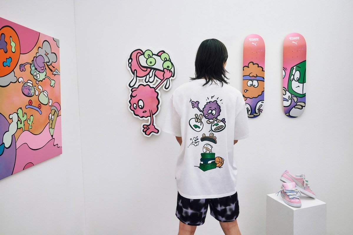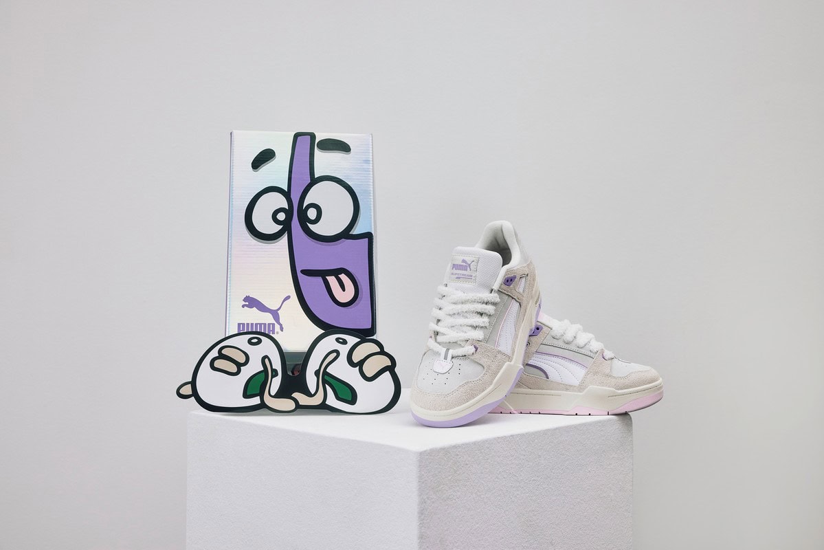 Il personaggio Fluzz di 8enjamin caratterizza inoltre le sneakers Suede e Slipstream. Omaggio ad alcune delle sneakers preferite dall’artista e ai modelli che lui stesso ama indossare, la Suede viene reimmaginata con una tomaia light pink, lacci morbidi ed esagerati e un hangtag personalizzato Fluzz.