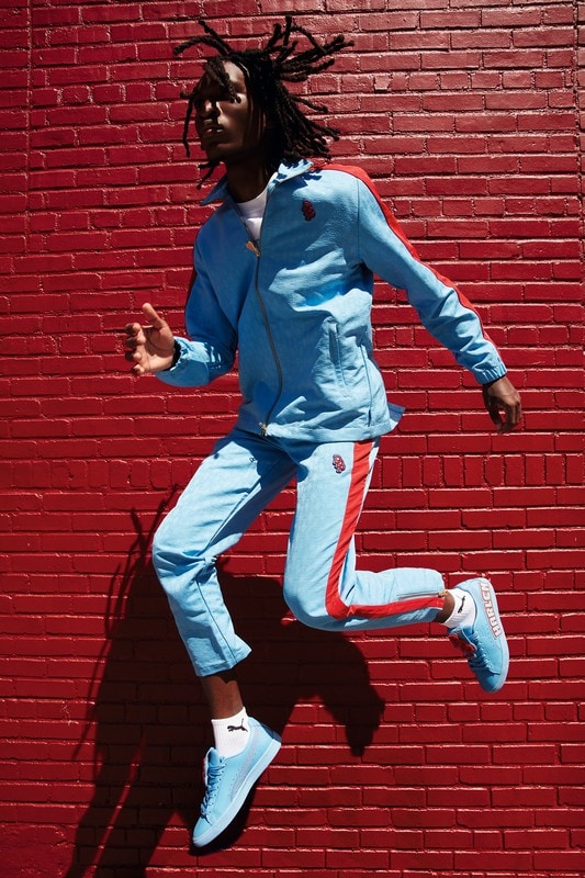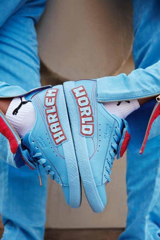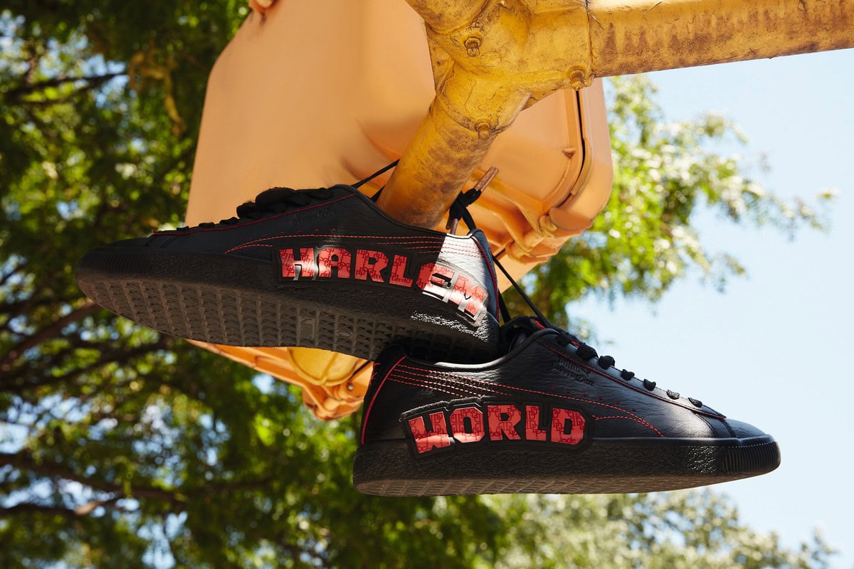 Le sneakers della collezione si concentrano su due caposaldi dello stile hip-hop, le Clyde e le Slipstream, entrambe trasformate come mai prima d’ora. In due colorway, la Clyde passa da “Harlem” al “World”, con un lettering e una linguetta esagerati che richiamano le scarpe da calcio degli anni ’60 e ’70. La Slipstream è avvolta in un parafango gommato accentuato da un hardware dorato e una catena applicata alla tomaia.