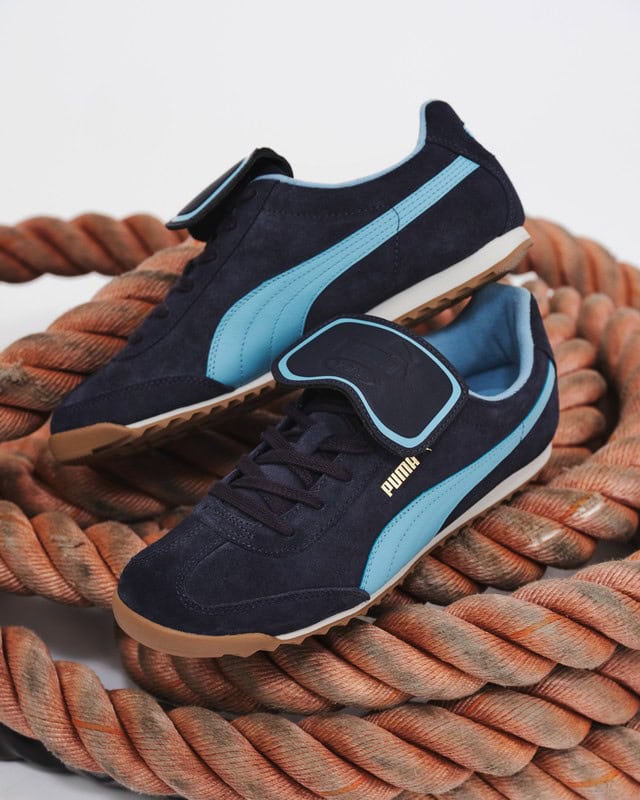 Cuore pulsante della collaborazione, vedono come protagoniste la sneaker Puma Arizona e il Wrestling Boot, entrambe interpretazioni moderne di modelli classici. La Arizona si distingue per la sua tomaia in morbida pelle scamosciata e cashmere blu navy, impreziosita da un Formstrip in pelle powder blue e una suola in gomma, rifinita con i loghi Puma e Noah. Il Wrestling Boot, presentato nei toni del grigio e del bianco, esalta il mood retro con dettagli in pelle e accenti dorati, simbolo di un’estetica che unisce tradizione e innovazione.