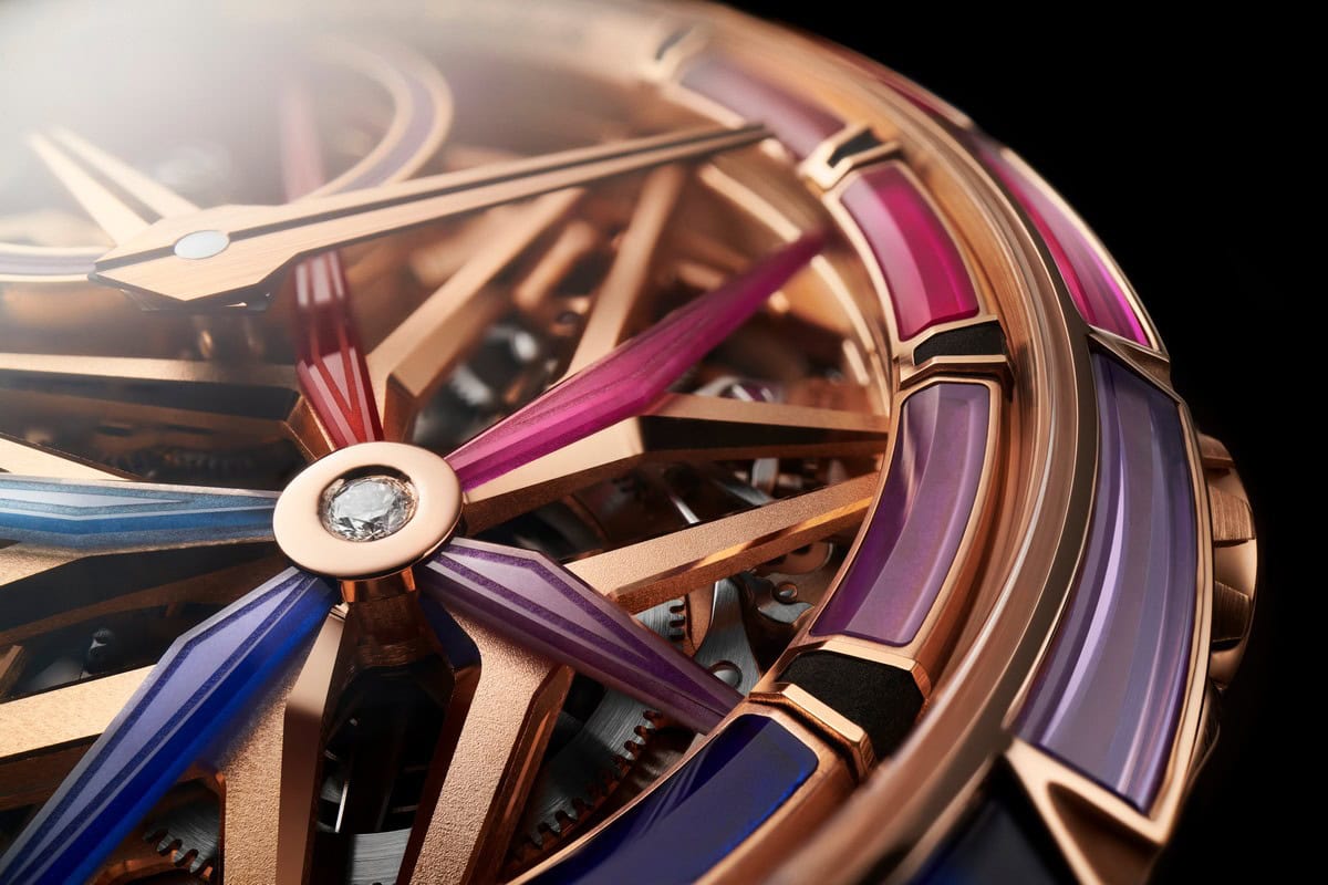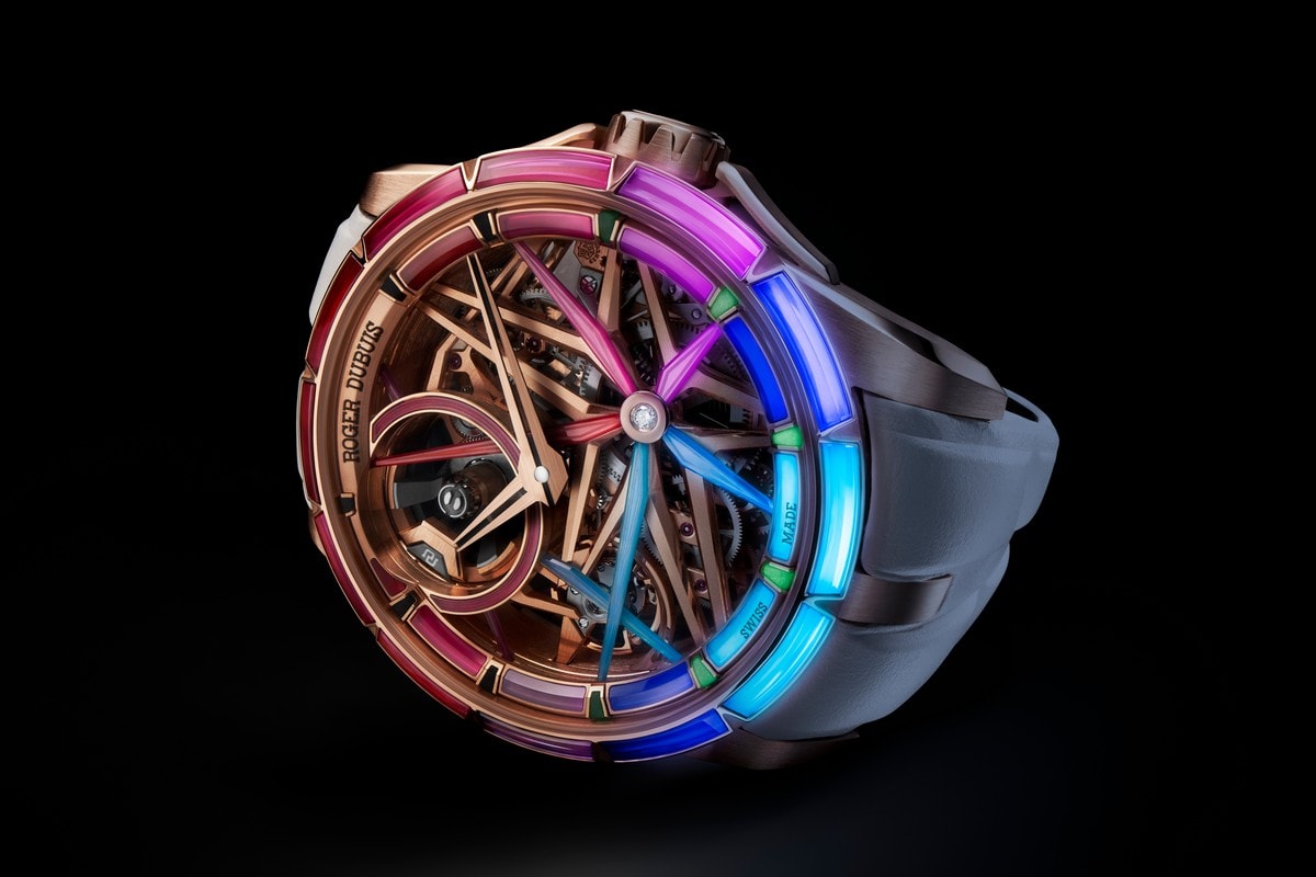 L’occhio viene immediatamente attratto dai vivaci spinelli che adornano questa creazione di Hyper Horology. Con sfumature dal rosso al blu e rivestito di Super-LumiNova, ogni straordinario spinello risplende con i suoi intensi colori, di giorno, di notte e sotto i raggi UV. Questo effetto multicolore conferisce all’orologio il suo inconfondibile aspetto cromatico e mette magnificamente in evidenza la costante dedizione di Roger Dubuis all’intricata arte della luminescenza.