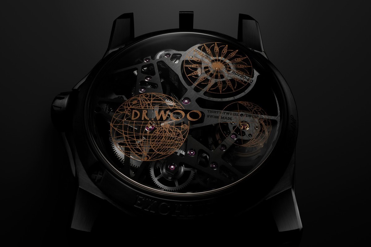 Come se si stesse fissando il cielo notturno, questa fantastica visione di componenti in movimento ha una qualità travolgente che affascina per ore chi a indossa il segnatempo. Il tema è replicato anche sul fondello, dove il sole, la Terra e la luna sono stati incisi accanto al nome di Dr. Woo.