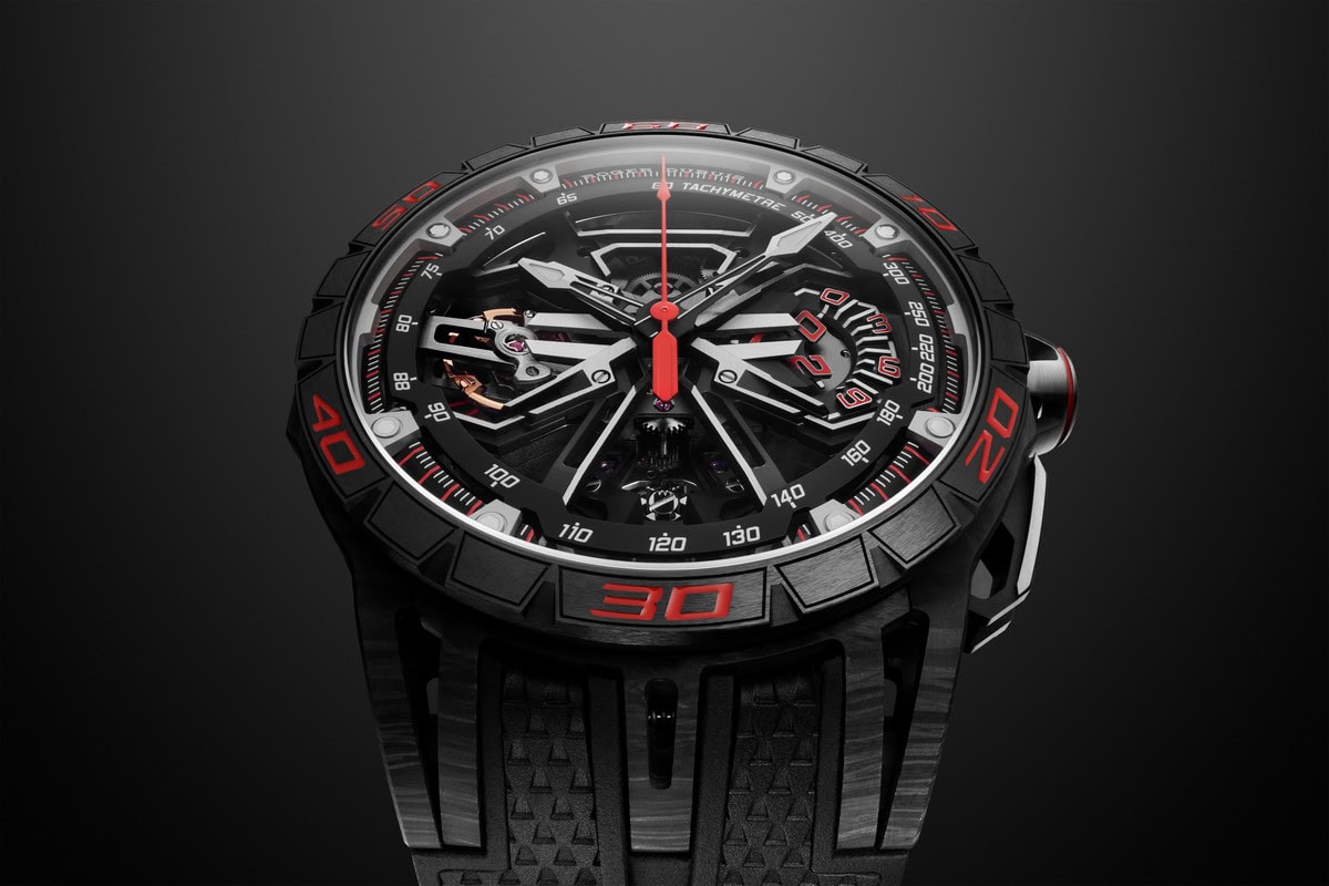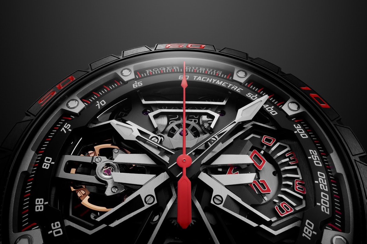 La combinazione di carbonio e ceramica è un altro omaggio alla costruzione delle supercar, che spesso integrano questi materiali nei componenti più sensibili e vitali come i freni. Vi troverete immersi in un design multidimensionale, a cui Roger Dubuis ha conferito profondità articolandolo su superfici di diversi livelli. A partire dalla scala tachimetrica, passando per il display del datario sottostante, per poi finire con la lancetta dei secondi rialzata, queste superfici parallele sono disposte in tutte le angolazioni e altezze possibili. Si tratta di una struttura dinamica ed espressiva che rivela qualcosa di nuovo ad ogni sguardo.