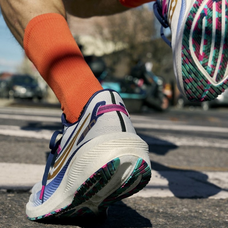 Triumph 20 debutta nella variante Prospect Glass caratterizzata da una tomaia a predominanza bianca sferzata da dettagli blu e fucsia che rimandano al caleidoscopio di colori della suola, vero tratto distintivo di questa colorazione da scoprire ad ogni falcata.