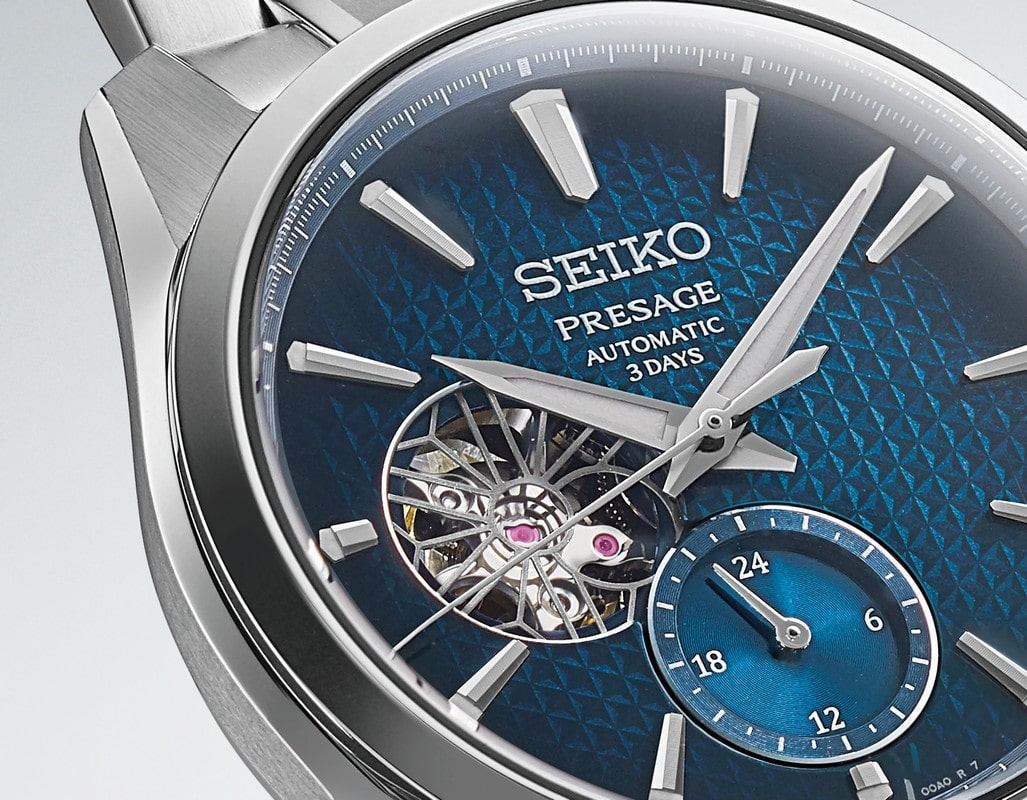 prova delle ampie competenze e delle tecniche di produzione avanzate di Seiko. Un quadrante “open heart” e un movimento con una riserva di carica di tre giorni.