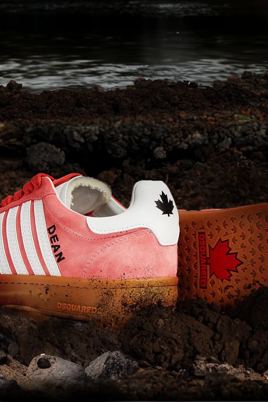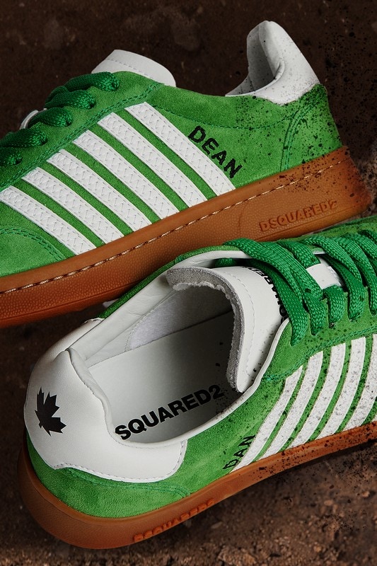 Guardando da vicino, la Boxer rivela il suo DNA Dsquared2: una foglia d’acero stampata sul tirante in pelle posteriore, i nomi dei designer Dean e Dan ricamati sopra le strisce, mentre il logo è presente sulla linguetta e sulle suole bianche o color miele.