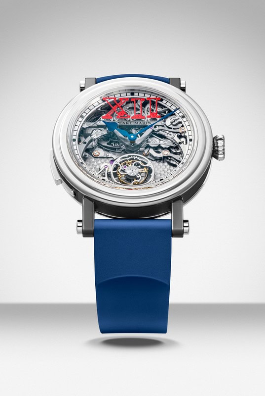 Il tourbillon volante di 60 secondi è visibile a ore 6 e bilancia il design del quadrante traforato che mette in primo piano il movimento. Come in tutti i modelli Speake Marin dotati del meccanismo a tourbillon, il ponte superiore ha la forma del “topping tool”. Una volta attivato dal cursore, il meccanismo della Ripetizione Minuti Carillon prende vita ed è completamente visibile a ore 12. La struttura del movimento è decisamente affascinante, in quanto controbilancia il tourbillon a ore 6 e valorizza i molteplici componenti necessari a un