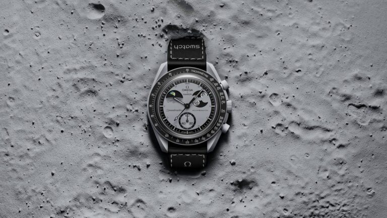 Per quanto riguarda i materiali, Swatch ha scelto di utilizzare la Bioceramic, una lega composta per due terzi di ceramica e per un terzo da materiali derivati dall’olio di ricino, che conferisce al modello una resistenza leggera e una texture piacevole al tatto. La lunetta è caratterizzata da una scala tachimetrica in nero con indici grigio chiaro, un dettaglio che richiama lo stile iconico degli orologi della linea Speedmaster di Omega.