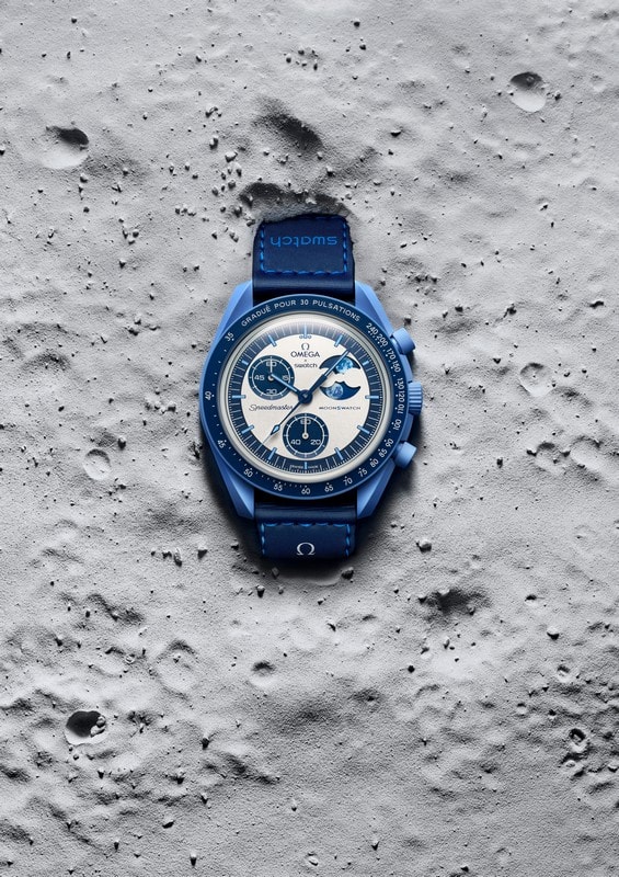 Sul retro della cassa, il nuovo orologio riporta l’intento della missione e i loghi Omega X Swatch sono presenti sia sul quadrante che sulla corona. Il coperchio della batteria è decorato con una luna dalle sfumature blu. Il cinturino Velcro blu, perfetto per essere indossato anche con una tuta spaziale, aggiunge un tocco di eleganza.