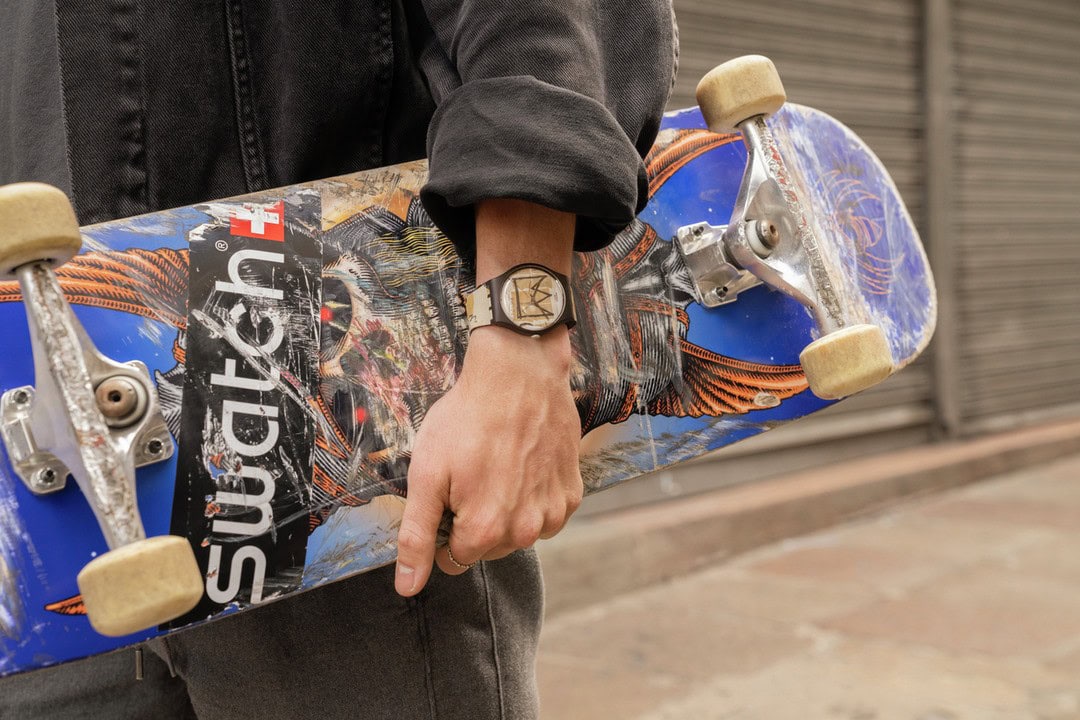 Tre orologi e un set speciale densi di potenti immagini e codici di ogni sorta catturano lo stile tipico di Basquiat. Ogni orologio è un capolavoro a sé stante che da libero sfogo alle composizioni originali dell’artista e al suo spirito audace. Per la campagna della collezione, Swatch ha collegato l’arte di Basquiat alla cultura urbana odierna rappresentata dallo skating e dalla BMX.
