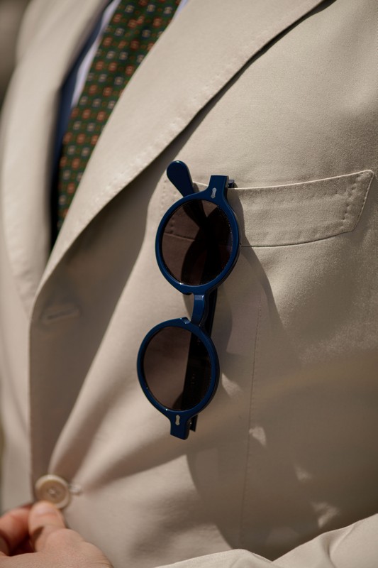 Il blu identificativo di E. Marinella prende vita nelle lastre di bio-acetato italiano. Le forme armoniose dei modelli Oxford e Pleat sono disponibili in blu navy, il primo abbinato alle lenti grigio fumo e il secondo alla clip vintage blu.