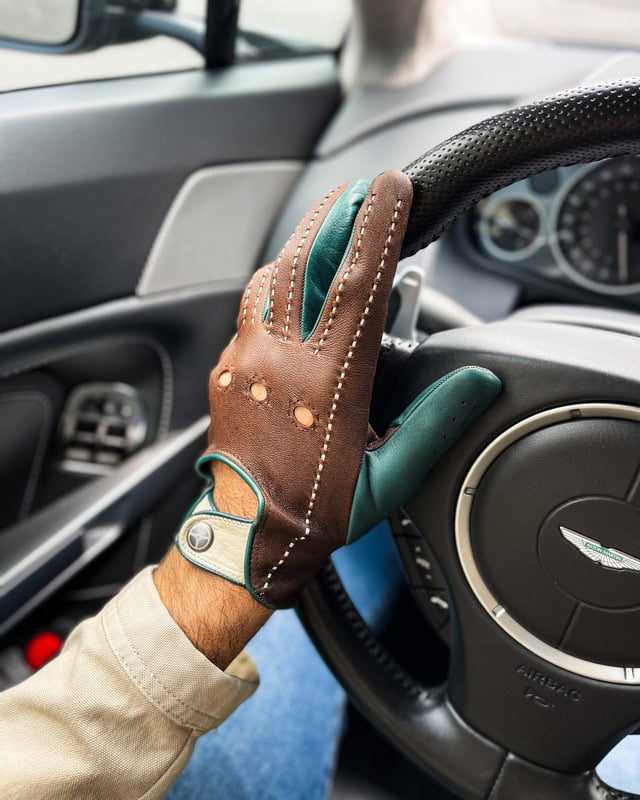 Guanti da guida in nappa d’agnello leggera e morbida sulla pelle, con dorso e palmo perforati per una migliore traspirazione, che combinano la ricerca sul look dei piloti degli anni Cinquanta e Sessanta – sintetizzata in dettagli come la pelle effetto vintage – a uno studio delle caratteristiche ottimali per garantire la migliore presa sul volante.