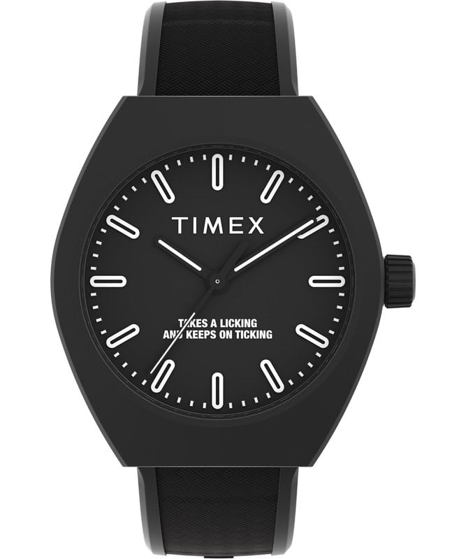 Il cinturino nero, realizzato in resina biologica, offre un comfort eccezionale al polso. La sottile trama intrecciata al centro del cinturino gli conferisce un aspetto distintivo, mentre la fibbia ad ardiglione, con inciso il logo Timex, assicura una chiusura sicura e pratica.