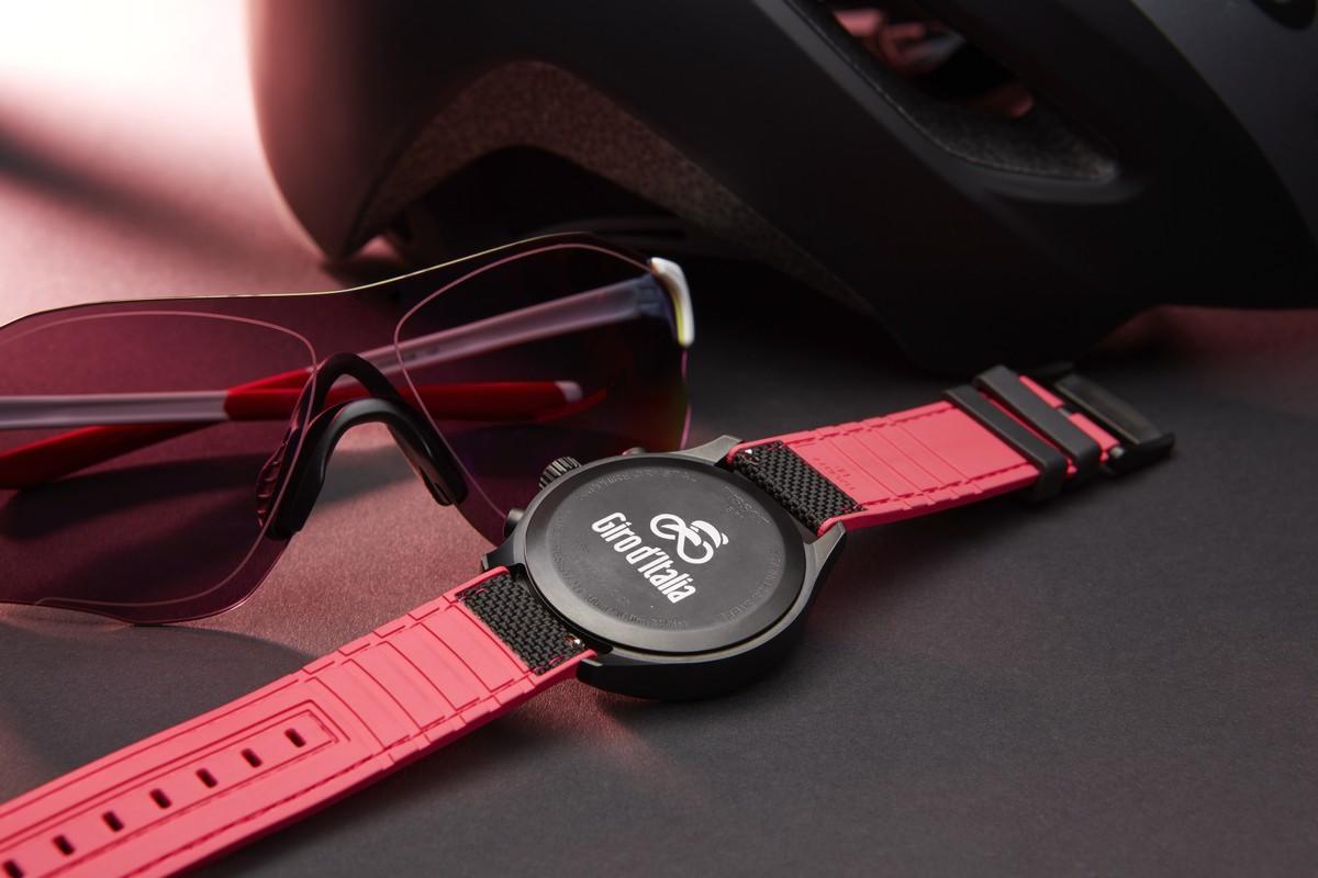 L’orologio ha un un movimento al quarzo. Una cassa in acciaio 316 L da 45 mm con trattamento PVD nero e vetro zaffiro antigraffio, è impermeabile fino a 100 m. La Special Edition comprende cinturini intercambiabili, il fondello con incisione del logo del Giro.