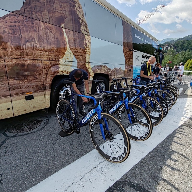 All’interno del paddock i team provvedono a tutti i controlli prima della partenza della tappa, qui stanno verificando la pressione delle gomme.