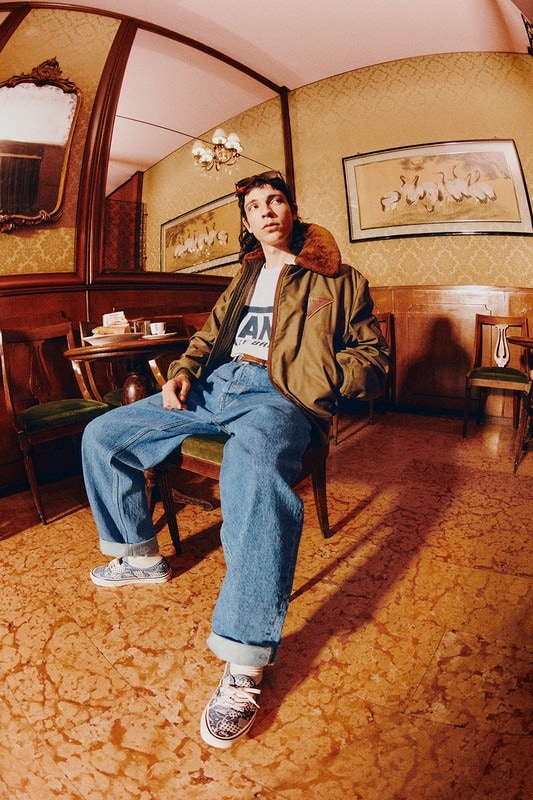 La stampa bandana è presente anche sui capi d’abbigliamento, con una fodera stampata in digitale sulla giacca e una fodera sulle tasche dei jeans. La giacca include anche una miniatura di una scarpa Era ricamata sulla tasca destra del petto, un ulteriore richiamo a una giacca denim d’archivio trovata a Bologna.