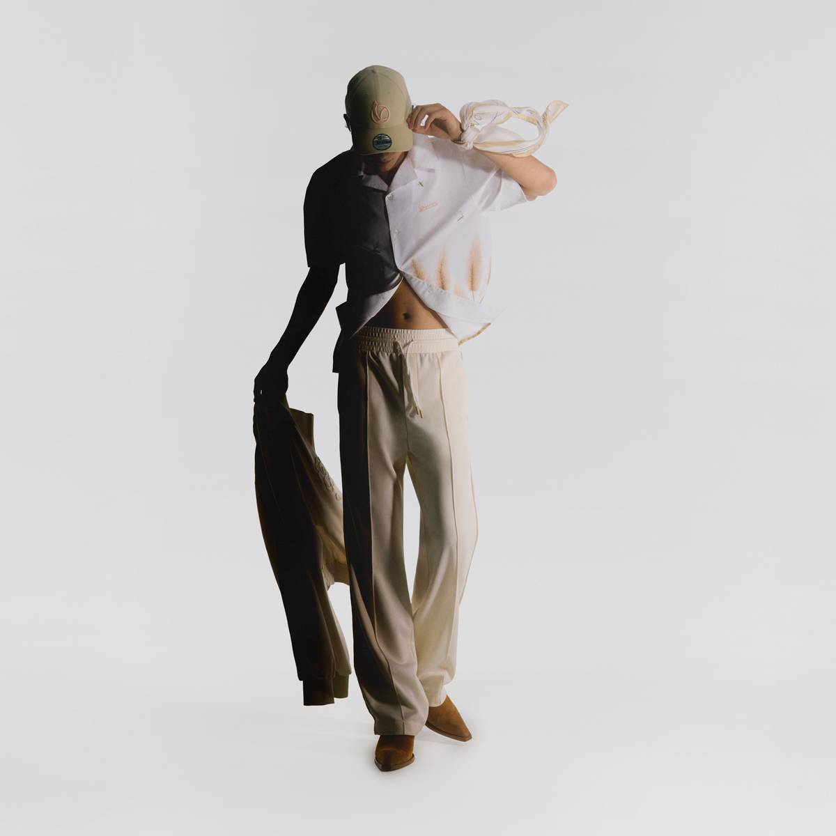 La collezione si muove tra suggestioni naturalistiche e riferimenti urbani. La bowling shirt stampata con campi dorati restituisce una sensazione visiva intensa, evocando la bellezza della natura al culmine della sua stagione. Accanto a questa, prendono forma capi che alternano romanticismo a praticità: gilet a trecce, giacche barn dal taglio funzionale, pantaloni ampi e suit destrutturati.