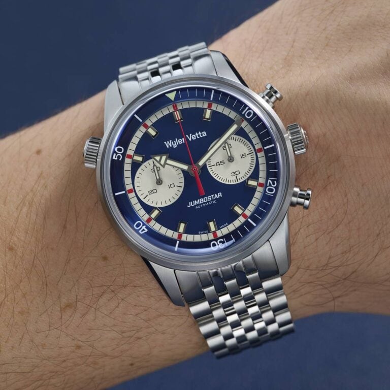I cronografi sono protetti da un vetro zaffiro bombato antiriflesso, un richiamo diretto allo stile degli anni Sessanta, e presentano due contatori cronografici posizionati a ore 3 e 9, dedicati rispettivamente alla misurazione dei secondi e dei minuti. Il logo Wyler Vetta spicca alle ore 12, mentre il nome Jumbostar e la dicitura “automatic” sono collocati alle ore 6.