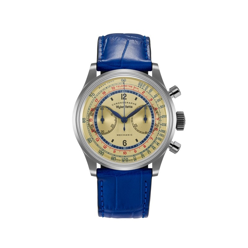 Le lancette delle ore e dei minuti, anch’esse di colore blu, mantengono la classica forma a foglia del modello storico. A ore 12, sopra il logo Wyler Vetta, è presente la scritta “chronographe”, in francese, un dettaglio che richiama le prime creazioni cronografiche del marchio.