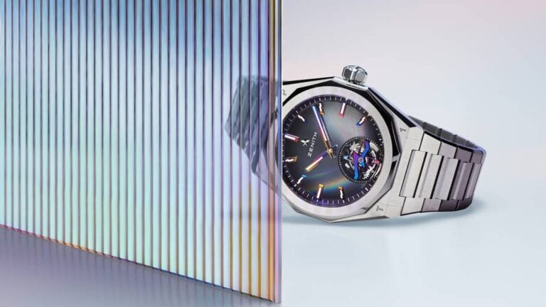 Il ponte del tourbillon è decorato con una sfumatura di toni arcobaleno metallizzati, ottenuta con una tecnica tridimensionale di deposizione fisica del vapore (PVD). Questo dettaglio cromatico riprende lo stile delle precedenti collaborazioni tra Zenith e Pantone, conferendo al movimento un’estetica vibrante e unica.