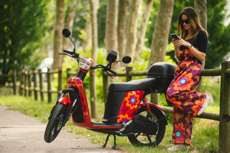 Askoll eS2 Evolution by Bragoon si distingue per la sua livrea inedita, che reinterpreta i tradizionali canoni estetici dell’iconico scooter vicentino ma con un tocco floreale, preso da una delle fantasie dei pantaloni antipioggia uni-sex e uni-size di Bragoon, che sono tutti realizzati in RePET, tessuto ottenuto dal riciclo delle bottiglie di plastica.