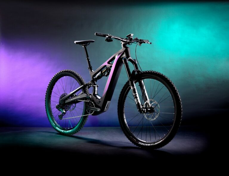 Inoltre, con l’obiettivo di offrire un maggior controllo della bici nei settori più difficili, i tecnici Bianchi hanno progettato il downtube e il movimento centrale in modo tale da ottenere una e-MTB dal baricentro basso tramite l’abbassamento della batteria e la rotazione di 28° dell’unità motore verso il retrotreno.