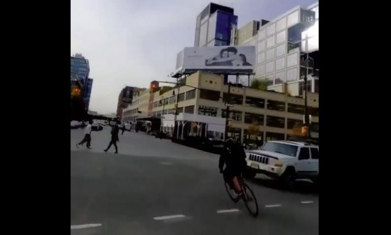 Il video che sta circolando sui social media mostra un ciclista che si muove in maniera sconsiderata nel traffico ed attraversa con il rosso un incrocio molto trafficato del meat packing district di New York, venendo investito da un’auto in transito.