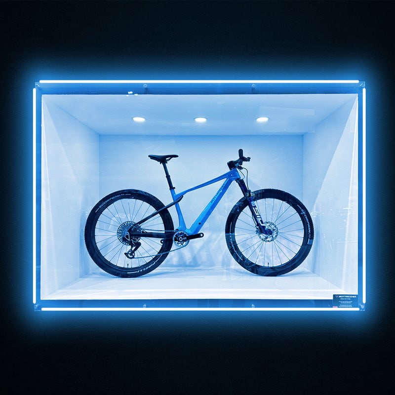 Dall’altra parte, il prototipo Full-mountain è stato progettato per competere ai massimi livelli nel cross country. Una tecnologia brevettata esclusiva integra completamente ammortizzatore e rocker nel downtube, coniugando l’estetica pulita di una hardtail alle prestazioni di una full suspended.