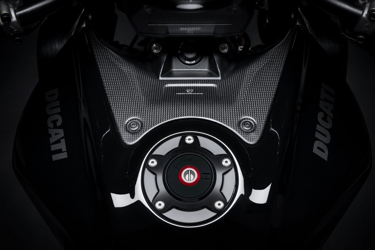 Il carbonio del parafango anteriore e della cover serbatoio, insieme alla cover scarico omologato che completa la dotazione, sono dettagli che impreziosiscono l’eleganza contemporanea di questa moto. Il Diavel V4 è poi ulteriormente valorizzato dal pacchetto Style, costituito dal parafango posteriore in fibra di carbonio, oltre che da una serie di accessori Ducati by Rizoma come leve, specchi, cover serbatoi fluidi freno e frizione nonché tappo carico olio in alluminio dal pieno.