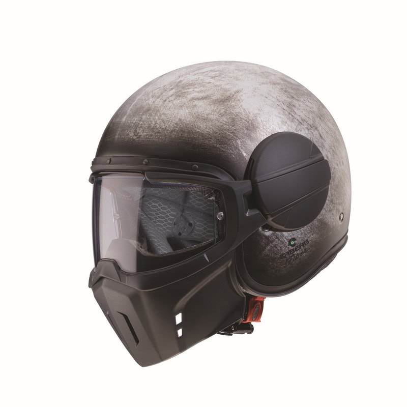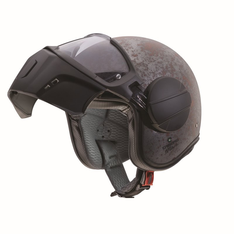 Grazie ad un meccanismo basculante a molle, il movimento di apertura e chiusura dell’insieme di visiera e maschera è semplice e intuitivo e può essere eseguito con estrema facilità utilizzando solo una mano (a differenza dei caschi Jet con occhiali o maschere con il tradizionale elastico).