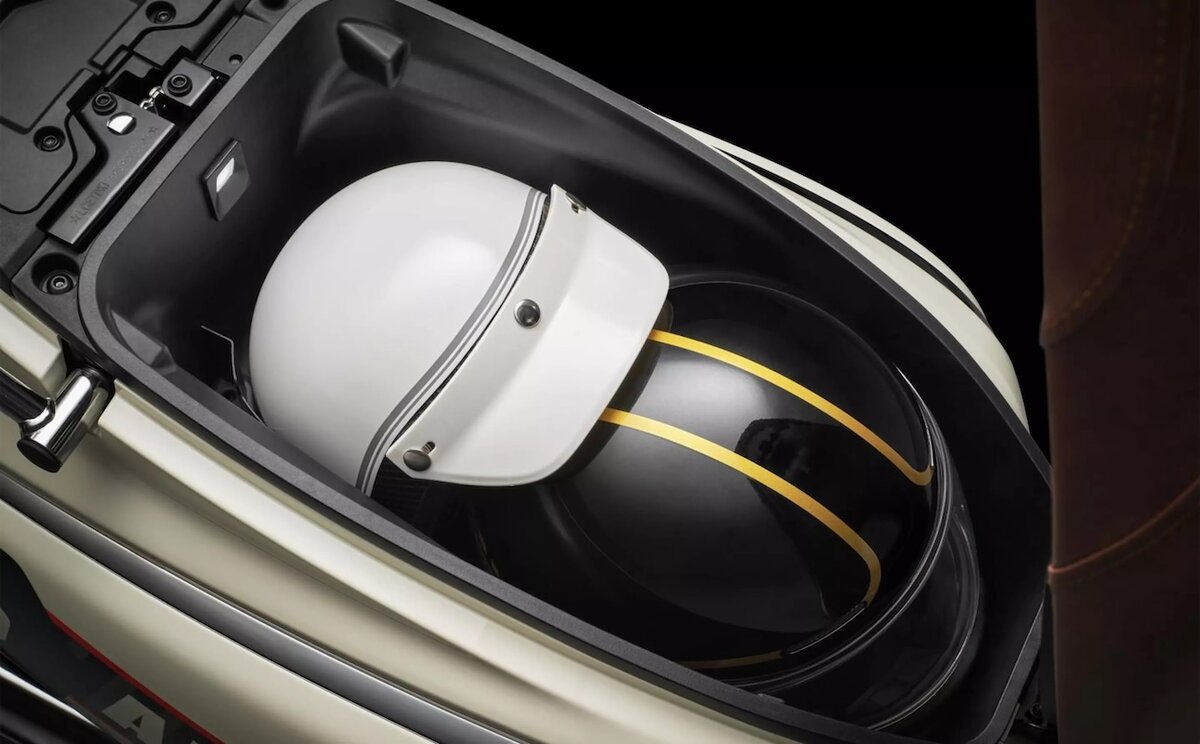 Per lo stivaggio, offre un vano sottosella capace di ospitare due caschi demi-jet, un gancio portaborse e un portapacchi anteriore da 5 kg.
