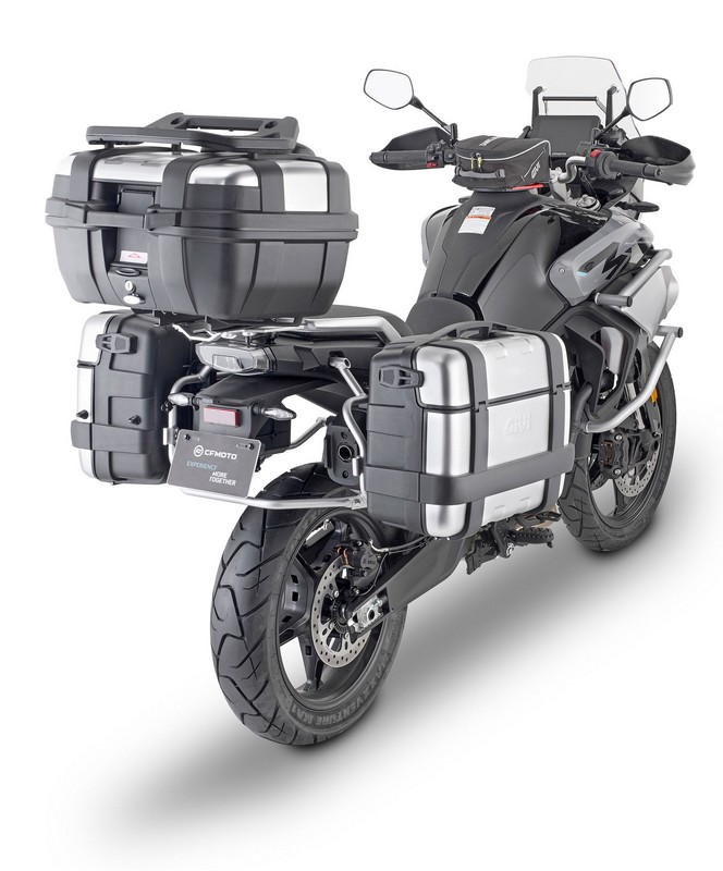 Le combinazioni di valigie Givi utilizzabili sulla Adventure di CFMoto sono molteplici. Il tris scelto per allestire la moto fa parte della linea Trekker (aggancio Monokey). Lo compongono le due laterali TRK33N e il topcase TRK52N accessoriato con portapacchino in nylon e schienalino imbottito. La borsa serbatoio consigliata è la EA144 della gamma Givi Easy-T.