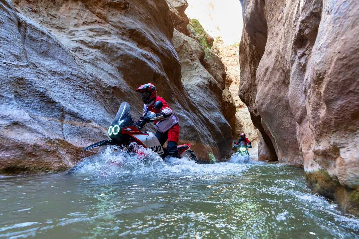 Le nuove sospensioni hanno permesso alla DesertX Rally di aumentare la luce a terra, ora di 280 mm (30 mm in più della standard), per permettergli di oltrepassare anche gli ostacoli delle mulattiere più scoscese.
