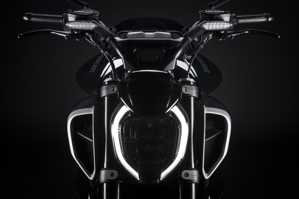 Anche la firma dei gruppi ottici anteriore e posteriore e gli indicatori di direzione, naturalmente full-Led, contribuiscono a caratterizzare in maniera inequivocabile l’estetica di Diavel V4. Il DRL anteriore cambia forma, con un profilo a doppia C evoluzione del precedente stilema. Il gruppo ottico posteriore è costituito da una matrice di Led puntiformi posizionata sotto il codone , anch’essa con una firma ottica inconfondibilmente Ducati: una soluzione unica, inedita e spettacolare, che rende la moto riconoscibile all’istante. Gli indicatori di direzione dinamici sono integrati nel manubrio, davanti ai serbatoietti dei comandi di freno e frizione.