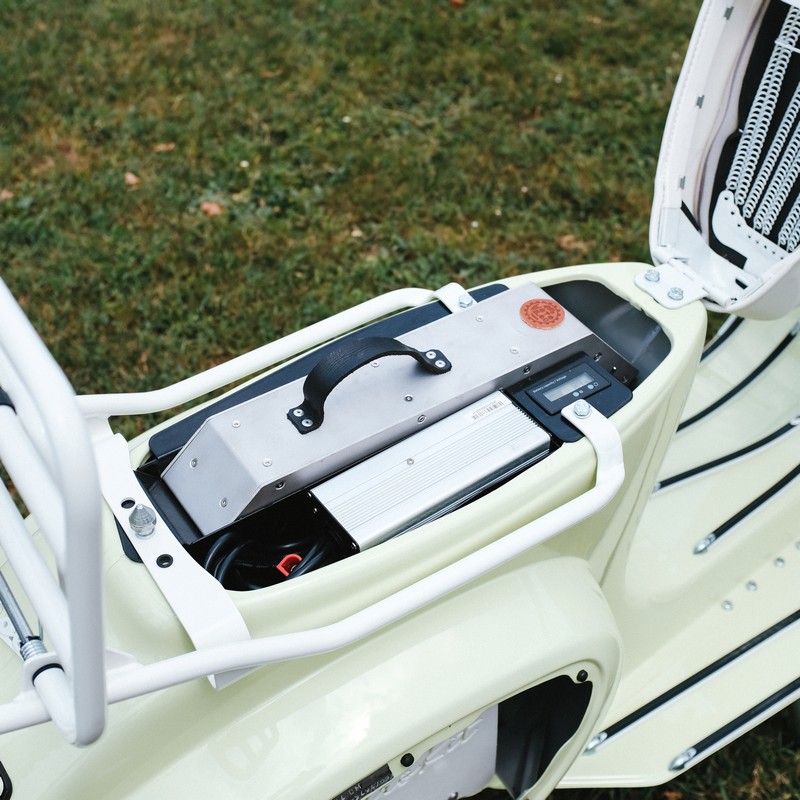 Studiato appositamente per Vespa, il kit di elettrificazione prende il posto del motore a combustione nello scompartimento laterale. Con una potenza di 7kW e un’autonomia di 100 km.